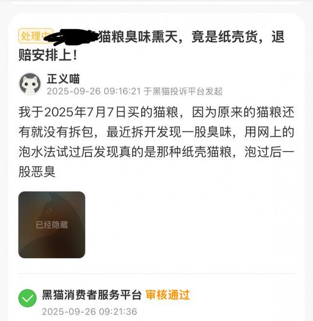 购买的猫粮臭味熏天,泡过水后,发现原料竟然是纸壳;直播间宣传猫粮粗蛋白含量是80%,到手