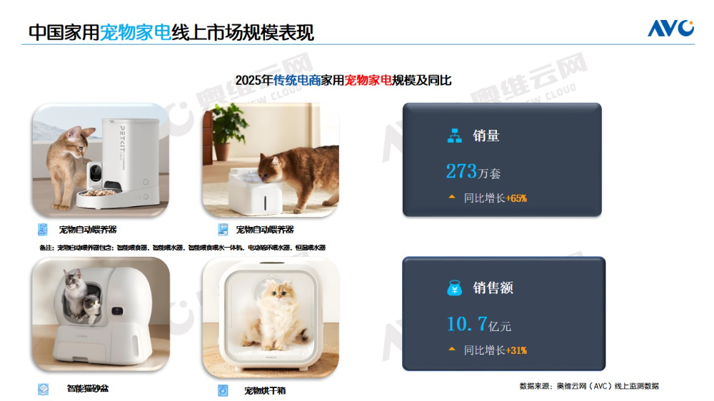2025年,中国宠物家电行业在“精细化养宠”与“科技化养宠”双趋势推动下,继续保持高速增长态势。据奥维云网(AVC)线年,传统电商渠道宠物家电整体销